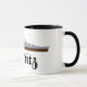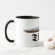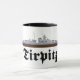 Mug with line drawing of the German battleship Tirpitz of the second world war, sister ship of the Bismarck, with the name of the ship written with fraktur letters.