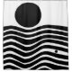 This shower curtain has Bauhaus design of wavy lines and circles in black on a field of white.