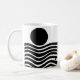 This mug has Bauhaus design of wavy lines and circles in black on a field of white.