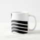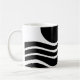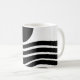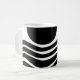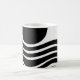 Cette tasse a le design Bauhaus de lignes ondulées et cercles en noir sur un champ de blanc.