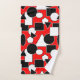 Ce kit de serviettes a une conception Bauhaus de triangles, cercles, rectangles et pentagons en noir et blanc sur un champ de rouge.