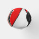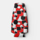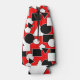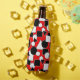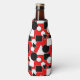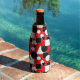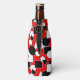 This bottle cooler has a Bauhaus design of triangles, circles, rectangles, and pentagons in black and white on a field of red.