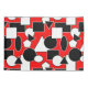This pillowcase has a Bauhaus design of triangles, circles, rectangles, and pentagons in black and white on a field of red.