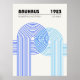 Minimalist Bauhaus-style poster featuring geometric blue circular patterns, advertising the 1923 exhibition held from July to September.