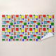 This shower curtain has a light blue washcloth, a blue hand towel, and a bath towel with a Bauhaus design of a grid with squares and rectangles in red, green, blue, orange, light blue, yellow, and red.
