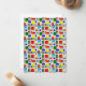 This note card has a Bauhaus design of a grid with squares and rectangles in red, green, blue, orange, light blue, yellow, and red.