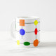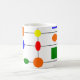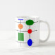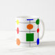 This mug has a Bauhaus design of a grid with shapes in red, yellow, orange, green, and blue plotted on it.
