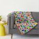This throw blanket has a Bauhaus design of a grid with squares and rectangles in red, green, blue, orange, light blue, yellow, and red.
