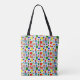 This tote bag has a Bauhaus design of a grid with squares and rectangles in red, green, blue, orange, light blue, yellow, and red.