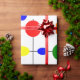 This wrapping paper has a Bauhaus design of a grid with shapes in red, yellow, orange, green, and blue plotted on it.