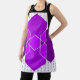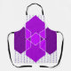 This apron has a Bauhaus design of overlapping hexagons in shades of purple on a field of white and dotted purple lines.