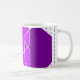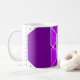 This mug has a Bauhaus design of overlapping hexagons in shades of purple on a field of white and dotted purple lines.