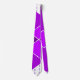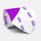 This tie has a Bauhaus design of overlapping hexagons in shades of purple on a field of white and dotted purple lines.
