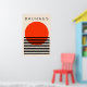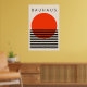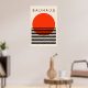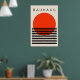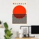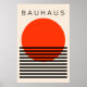 A modern art design in the Bauhaus style of a orange red sun with black horizontal lines on a beige background.