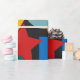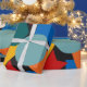 This wrapping paper has a Bauhaus design of random shapes in blue, teal, yellow, red, and orange.