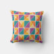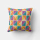 This throw pillow has a Bauhaus design of squares made of triangles in shades of orange, yellow, purple, and blue.