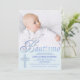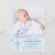 The soft blue background has the Spanish word "Bautismo" written on its upper most border and hangs over your baby's photo. It is embellished with an intricate blue cross. An elegant and stylish invitation.