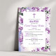 Celebra el Bautismo religioso de tu hijo con esta elegante Invitación con Flores Moradas, que presenta lindas flores moradas y una cruz. Ideal para una fiesta de Bautismo Católico.