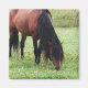 Photograph of a bay pony, horse, grazing in a patch of clover.