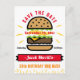 Announce your BBQ birthday party to family and friends with this custom announcement postcard suitable for all ages, featuring a modern graphic of a burger with flames in red, orange yellow, brown and black on a white background with colourful typography in bold fonts. Personalize it with all the details you need to invite your guests including the name, age, day, date and occasion on the cover and additional information with the addresses and RSVP details on the back. Designed by © Tim Coffey.