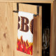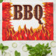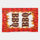A hand towel reading BBQ in a western flaming font for cooks and cookout chefs. With graphic art of red and orange flames at the bottom of the design.