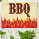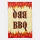A hand towel reading BBQ in a western flaming font, with graphic art of red and orange flames at the bottom of the design on a faux parchment background.