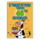 "I 'herd' it was your 46th birthday!" fun b-day cow holding a birthday cake greeting card.