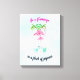 A canvas print with a cute saying: Be a flamingo in a flock of pigeons. Designed with an illustration of a momma and baby pink flamingo standing on a bed of floral succulent flowers with green palm trees swaying in the back. Tropical and pretty. The background is a summery light blue watercolor with hints of purple.