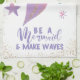 Whimsical and magical design with quote featuring a pink, teal, purple ombre mermaid tail with faux gold glitter details with stars and splash of water around. The typography text at the bottom says "Be A Mermaid & Make Waves."