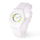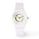 Accessorize with this very cute celestial timepiece for any occasion. Four yellow stars on a black crescent moon, surrounded by green dots, on a white background.