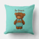 Cute baby boy teddy bear hand drawn all dressed in jade colour polka dot overalls and jade polka dot bow tie. "be brave" script typography above little baby boy teddy and baby's name below. Back side of this cute baby throw pillow is matching jade polka dots. An excellent decor to inspire your baby as he grows up. Personalize with your own title and baby name.