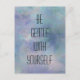 Wise words which say: Be gentle with yourself. Quotation typography to remind and encourage. A soft delicate abstract background created from watercolor paints in the colours of green, pink and purple. A pastel looking impressionist design with an ethereal dreamy misty feel.
