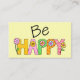 The "Be Happy" Mini card is a personal way to let someone know that you are wanting to share some encouragement with them, letting them know you truly care. This image emotes a bit of happiness with the flowers, overall whimsical design, yellow background, and of course the words Be Happy. The word happy was hand painted for that personal touch. The back is blank so you can send along a special note if you'd like. This card is also suitable for birthdays, graduations, new jobs, and other categories. Enjoy!