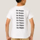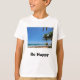 T-shirt with a relaxing tropical island photo and the words "Be Happy". Text is repeated on the back.