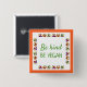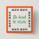 This square button is designed for a vegan to wear. It has the words - Be kind BE VEGAN - in green on a white background, and is decorated with colourful vegetables and a pumpkin orange border.