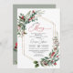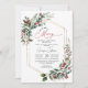 Featuring a sophisticated gold geometric frame adorned with lush watercolor greenery and festive red berries, this design blends elegance and seasonal cheer. The bold red script "Merry" adds a striking yet refined touch, making this invitation ideal for winter / Christmas themed bridal showers.