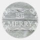 A chic and stylish Christmas sticker seal with a grey wood grain background.The rustic seals have the words BE MERRY on it with a white flourish frame.