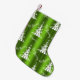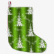 A very festive green and white Christmas stocking featuring a pattern of white Christmas trees over a metallic green background, with the cheerful yuletide greeting of 'Be Merry' throughout.
