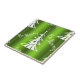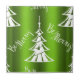 A colourful green and white Christmas tile featuring a contemporary white Christmas fir tree on a metallic green background, with the festive Christmas greeting of 'Be Merry' around it.