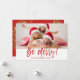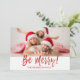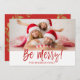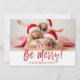 Be Merry Christmas Hand Lettered Script Photo Card. The photo and text of this hand lettered brush script can be updated and customized with your photo and family name. This card also displays the family name and a gold foil wreath on the back of the Christmas Card.