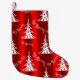 A bright and cheerful red and white Christmas stocking featuring a contemporary pattern of white Christmas fir trees over a metallic red background, with the cheerful yuletide greeting of 'Be Merry' scattered around them.
