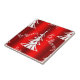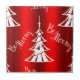 A stylish, modern red white Christmas tile featuring a contemporary white Christmas tree on a metallic red background, with the festive Christmas greeting of 'Be Merry' around it.