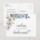 Elegant bridesmaid proposal postcard features watercolor floral drop of blue and neutral flowers and delicate calligraphy. Cards back with message for your bridesmaid and return address. Invitation perfect for winter and autumn weddings.