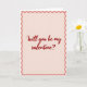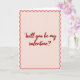 This card features a sweet, romantic setting with the words “Will you be my valentine?” written beautifully in dark red. The text pops against a soft light pink background, creating a warm and inviting place for such a heartfelt question. The overall mood feels hopeful and nostalgic, like an old-fashioned love letter.