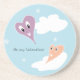 Love is in the air, two hearts flying in the sky among clouds and snowflakes and saying Be my Valentine!