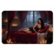 Crimson silk sighs beneath her, a river of satin catching the candlelight, petals like small, slow confessions scattered across the sheets, a silhouette in black that follows the line of her body, hair loose as dusk, a quiet smile that keeps the moment from demanding reason. A fireplace murmurs low, and shadows move like remembered music, while the bed holds the hush of something waiting to be named.
