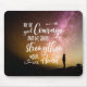 Mouse pad has a photo of a beautiful night sky with silhouette of person looking up and the scripture verse from Psalm 31:24, "Be of good COURAGE and He shall STRENGTHEN your heart all ye that HOPE in the Lord" in a loose handwritten script. Designed by Simply Scripture by Robin.