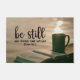 Inspirational scripture doormat depicts a peaceful scene of an open Bible sitting next to a cup of steaming hot beverage, maybe coffee or tea, on a railing overlooking the water. It features Bible Verse Psalm 46:10, "Be still and know that I am God."-