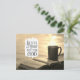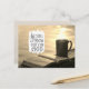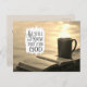 Inspirational scripture postcard depicts a peaceful scene of an open Bible sitting next to a cup of steaming hot beverage, maybe coffee or tea, on a railing overlooking the water. It features Bible Verse Psalm 46:10, "Be still and know that I am God."