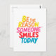 Brighten someone’s day with this cheerful and uplifting postcard featuring the inspiring phrase “Be the Reason Someone Smiles Today” in vibrant, colourful lettering. Whether you're gifting it to a friend or using it as a daily reminder to lead with kindness, this design delivers a message of encouragement, joy, and good vibes.